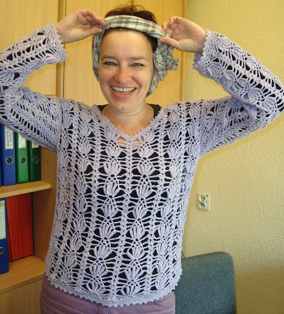 Wzór pochodzi z katalogu Sabrina robótki extra 3/2007 Jednak na potrzeby komody oryginał byłby za wąski to serwetkę poszerzyłam .Zaczęłam tez nową rzecz - niebieskie coś pokarzę po ukończeniu . Obrus niestety musi poczekać - szkoda by było gdybym się pomyliła we wzorze bo skupić to się jakoś nie mogę .