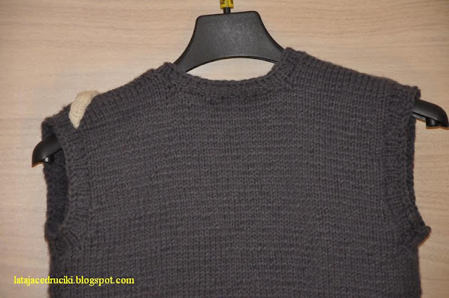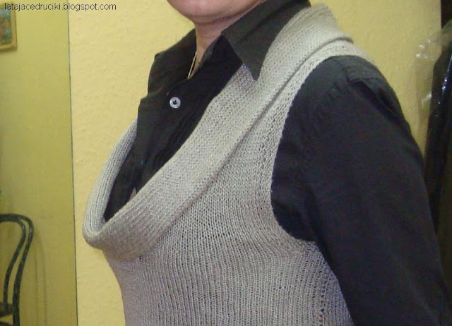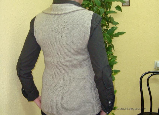 Przedstawiam Wam zatem kamizelkę już troszkę noszoną .Zrobiona w bardzo prosty sposób ,a jedyną jej ozdobą jest szalowe wykończenie dekoltu .