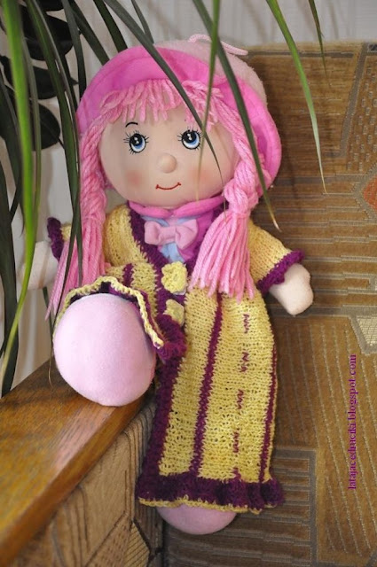 Ponieważ lalka była ubrana ,to zrobiłam jej sukienko - płaszczyk . Pod kwiatuszkami przyszyłam rzepy .