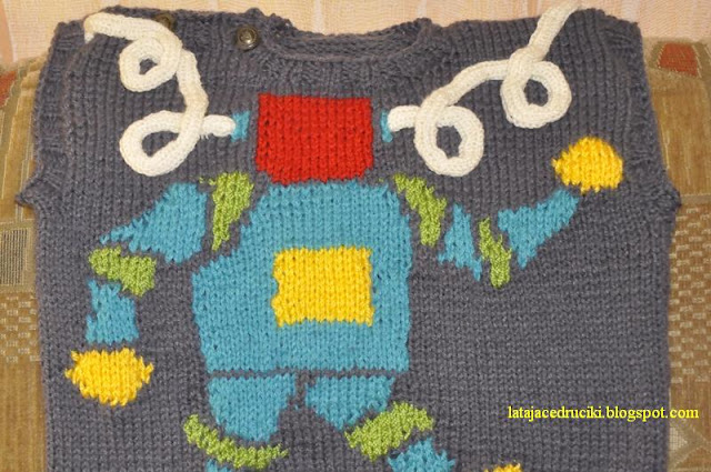 Hura udało mi się , zdążyłam zrobić kamizelkę . W tej chwili mały robot jest już u właściciela to i mogę się pochwalić . Nie zdążyłam tylko zblokować bo było mało czasu na wyschnięcie i nie chciałam ryzykować wożenia mokrej rzeczy .