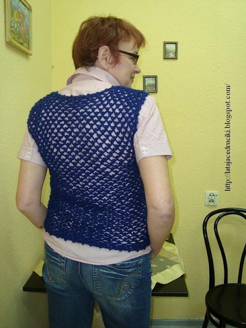 Dzisiaj tak szybciutko bo szykuję się do wyjazdu .Miedzy innymi i na ten wyjazd potrzebna mi będzie krótka kamizelka ,takie prawie nic .Pomyślałam poszperałam i wyszła mi taka oto siatka na ryby .