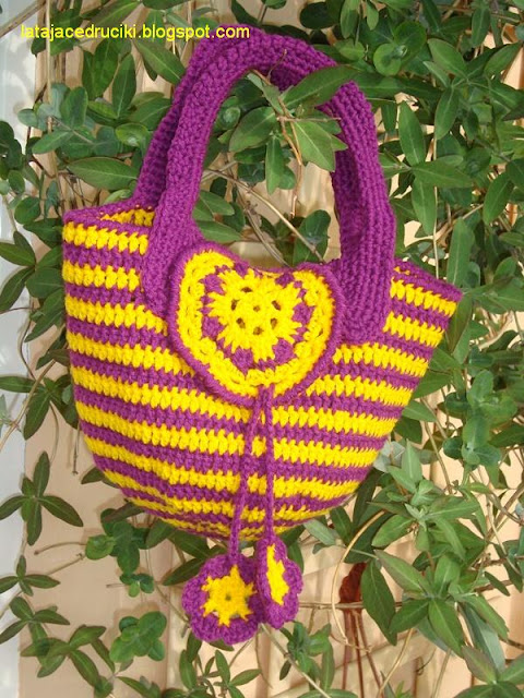 Do zrobienia torebek wykorzystałam akryl Porobiłam je w różnych kolorach i wielkościach - czyli kolejny pomysł na pozbycie się kłębuszków . Robiło się bardzo przyjemnie i szybko . Wzór na torebkę pochodzi z katalogu Sabrina Special S 03/13