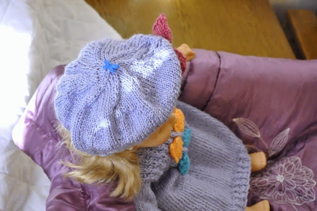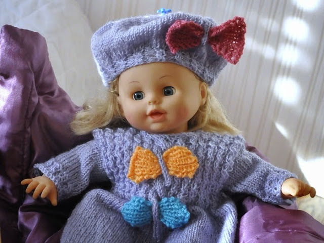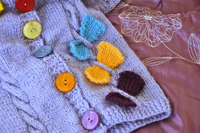 W liliowym sweterku ozdobą są kokardy i pasujące do nich kolorystycznie duże guziki .