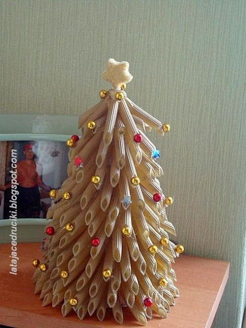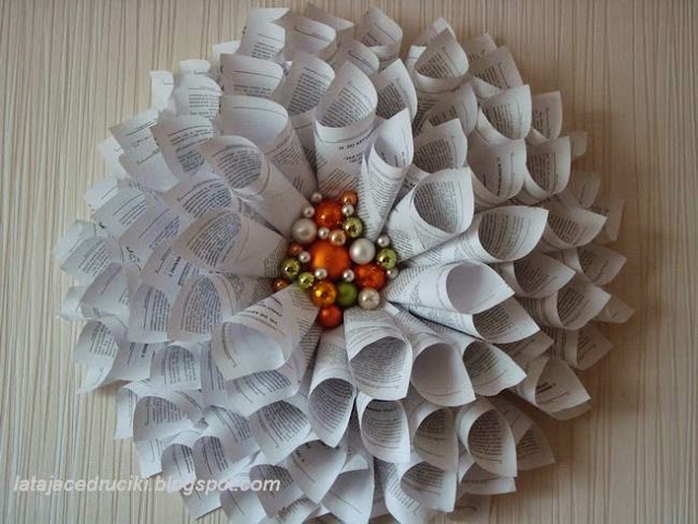 A w tym czasie kiedy bombki sobie podróżowały powstała jeszcze jedna apetyczna dekoracja - choinka makaronowa . Czyli już byłam bez dwóch obiadów . I żeby całkowicie nie głodzić rodzinki , chwyciłam się  za inne dekoracje i tak oto powstała rozeta książkowa - koniec z czytaniem w tym roku książki wiszą na ścianie .