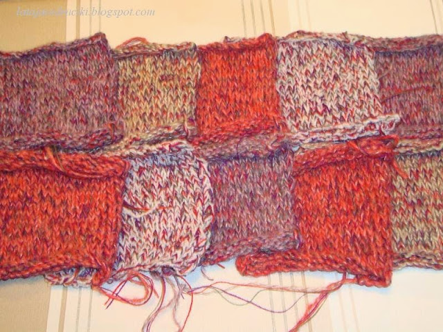 Zaczęłam robić kwadraty , kolory się zmieniały ale zawsze były trzy jednakowe nitki fioletu,zieleni i czerwieni