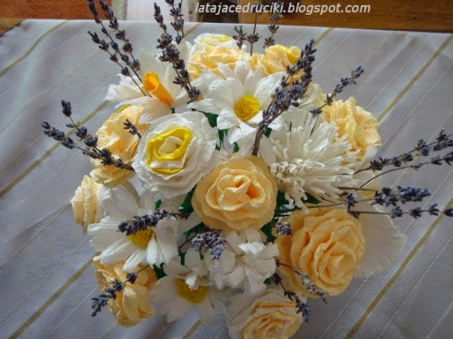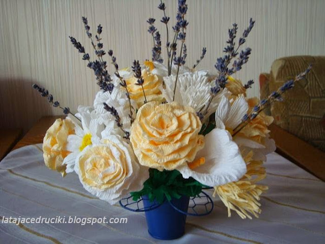 Suszona lawenda  dopełnia kompozycję i przełamuje sztuczny wygląd bukietu .