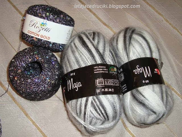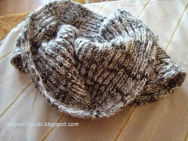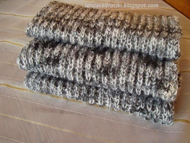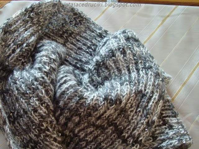 Po połączeniu obu nitek  wyszedł piękny  mieniący się cekinami szal.