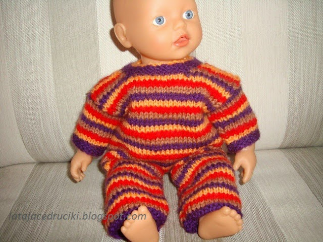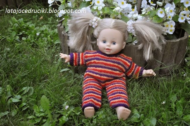 Pasiaczek jest całkiem legalnie podpatrzony z katalogu " HABITS DE POUPONS " Tylko cała ja zapomniałam o butach - cóż za niedoróba . Trzeba szybko naprawić błąd bo inaczej pasiaczek boso powędruje w świat .