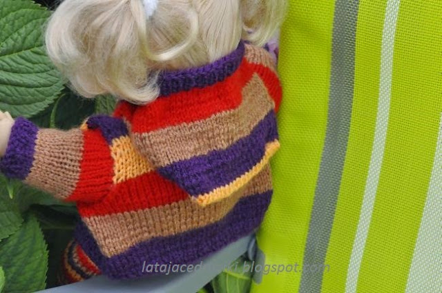 Do kompleciku dorobiłam sweterek w grubsze pasy .
