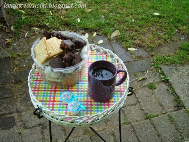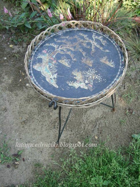 Deszczyk pada , a ja schowana pod daszkiem popijam kawusię . Jest mi przyjemnie i fajnie bo taka mała rzecz a cieszy , ale zacznę od początku . Na działce miałam bardzo , bardzo stary stoliczek , a może to jest kwietnik- obojętne .
