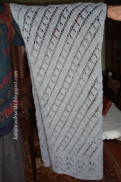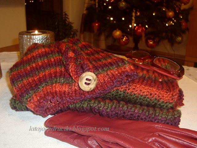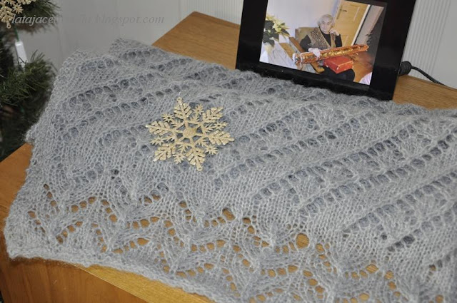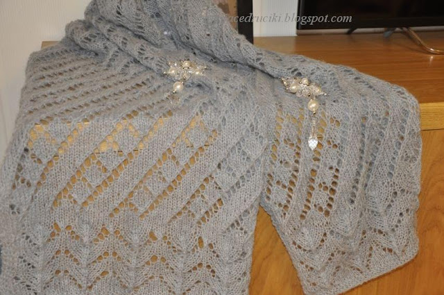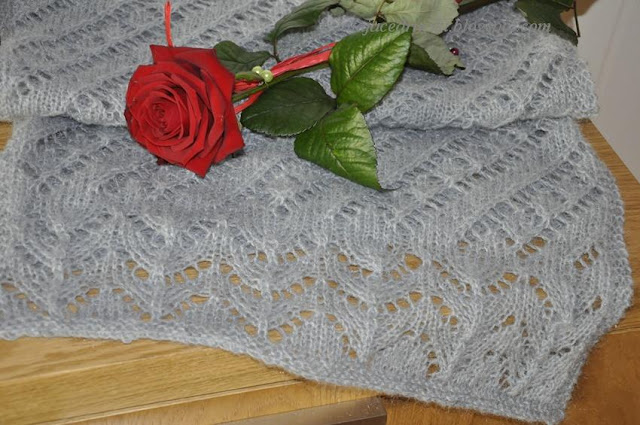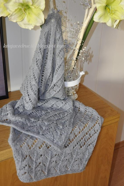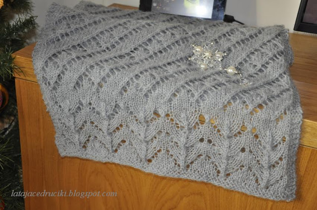 W tamtym roku zrobiłam swój pierwszy szal , teraz sięgnęłam znowu po włóczkę i zrobiłam następny . Ten jest grubszy , ale bardzo mięciutki i przyjemny w dotyku . Włóczka lekko moherowa .