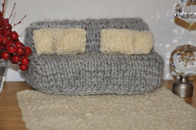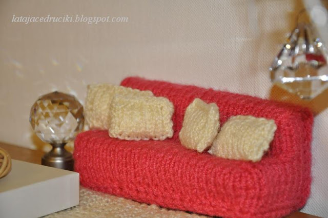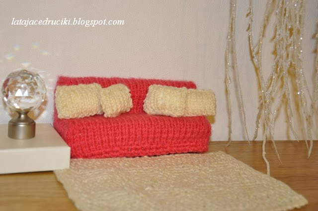 Ciociu możesz mi zrobić nową kanapę dla lalki ?- Różowa , różowa niech będzie ! No jak nie może - ciocia może zrobić i to z wielką chęcią ! I tak znowu chwyciłam za pudełko po syropie , powycinałam , posklejałam i podstawa była . Jak ma wyglądać pudełkowa podstawa pokazałam TUTAJ . Później wystarczyło tylko chwycić za włóczkę i druty i już gotowe . Można oczywiście obszyć podstawę materiałem jednak mi bliższa jest włóczka . Ponieważ kolorem różowym nie dysponowałam powstała malinowa kanapa . Dla złagodzenia koloru dorobiłam kremowe poduszki i dywanik , który pierwotnie miał być kocykiem dla Barbie .