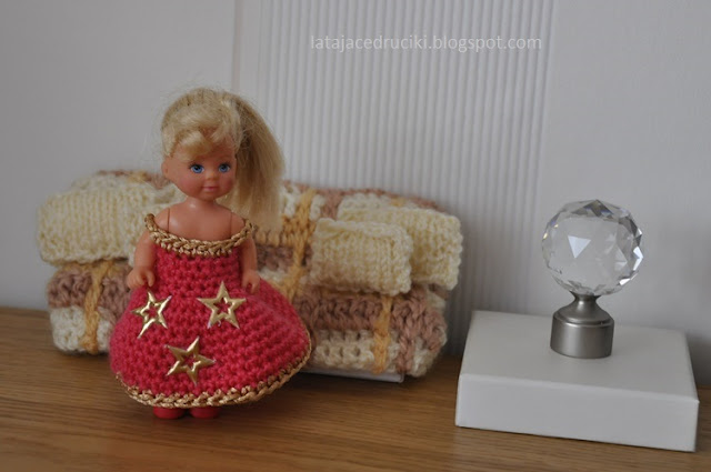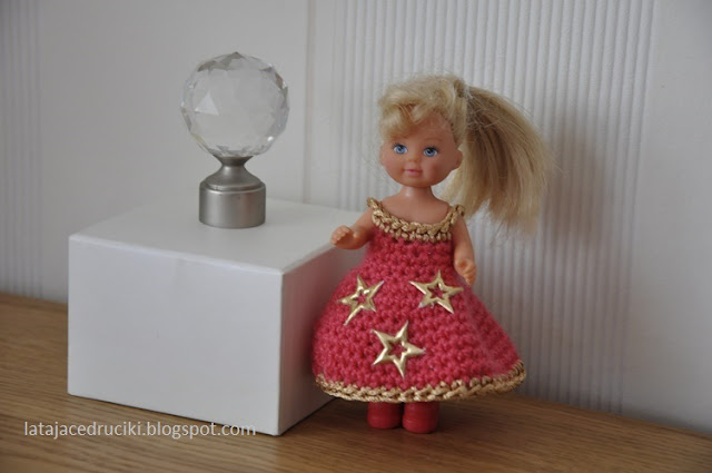 Sukieneczka na ramiączkach zrobionych ze złotej włóczki , wykończona złotymi gwiazdkami .