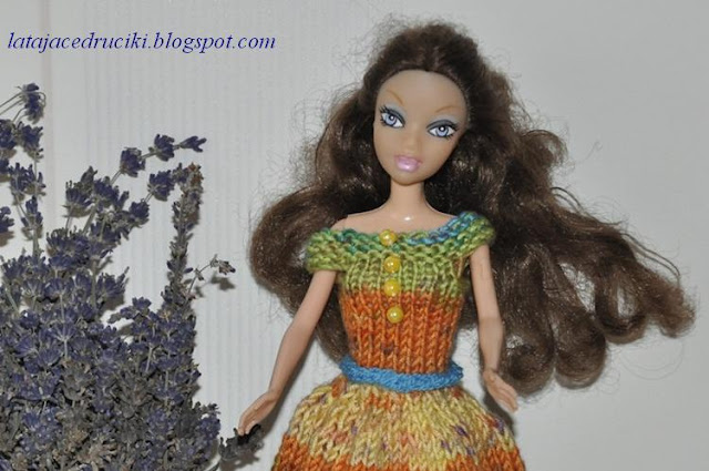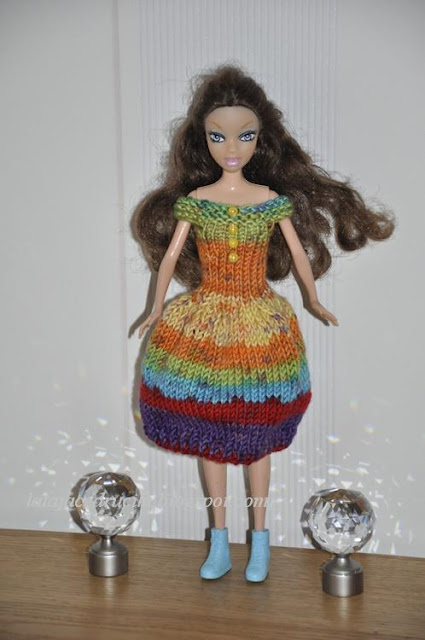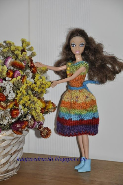Tym razem z włóczki skarpetkowej powstała " Tęczowa " sukienka dla Barbie . Nitka trochę grubsza niż zazwyczaj używam do strojów dla lalek ale nie psuje to końcowego efektu .Stosunkowo fajnie się robiło i szybciutko pojawiały się kolejne kolorowe paseczki tęczy .