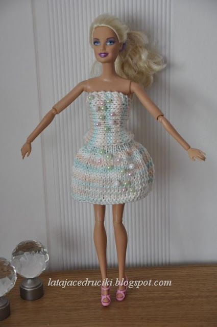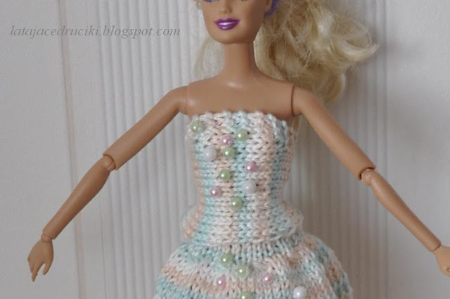 Tak będzie i tym razem . Kolejny gorset i spódniczka wykończony koralikami . Kolor włóczki jest bardzo delikatny , taki mało widoczny melanż . Takie też są i koraliki ozdabiające komplecik . Prawie nie widać ,że to są trzy różne kolory .