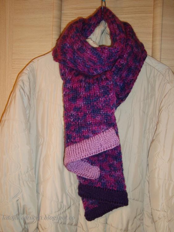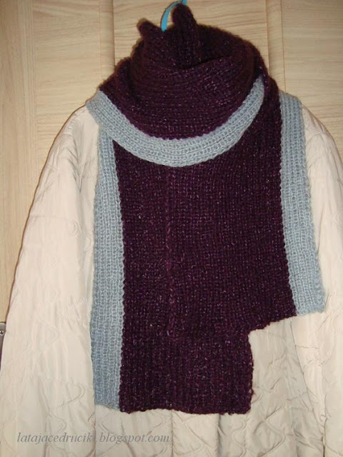 Ostatnio ciągle przesiaduję w domu z powodu ....... grypy. Ze zdrowiem jest już prawie dobrze, bo robić mi się chce i kręci, kręci, żeby coś z rękami zrobić. Niestety jednak z domu wychodzić nie można, a włóczkowe zapasy się pokończyły trzeba było coś wykombinować. Wpadł mi w ręce komin, który nie pasował mi do nowej kurtki, sprułam i oto jest szaliczek. Żeby było inaczej to szalik jest robiony od 5 oczek i co rząd dodawałam kolejne 5, do wymaganej szerokości. Plisy są obustronne.