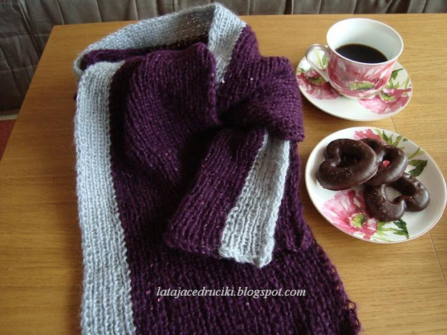 Zsiniały burak - no tak właśnie wyglądałam gdy przemarzłam. No cóż sama jestem sobie winna, a że za głupotę trzeba płacić to siedzę w domu z czerwonym nosem. Frania tylko dziwnie na mnie spogląda kiedy co jakiś czas słyszy .... a psik a psik.... Siedzi na kocu nogi mi grzeje i jakieś a psik słyszy. Ale wracając do tematu to gdy tak sobie leżałam bez siły to przyszedł mi do głowy pomysł na taki właśnie szalik siny buraczek. Jak tylko poczułam się mocniejsza natychmiast odszukałam odpowiednie kłębki włóczki. Buraczkowej z delikatnymi cekinami było stanowczo za mało na szalik, ale w połączeniu z siwym to już wystarczyło. Po chorobowym przyjdę do pracy z nowym szalikiem ... hm może jednak odczekam kilka dni ?