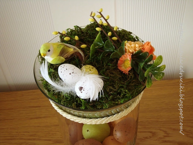 Za oknem już zielono ptaszki ćwierkają i budują sobie gniazda. Dlatego też w dekoracja świątecznych na ten rok królują gniazdka. Małe lub większe ale gniazdo musi być. Muszę przyznać, że taka dekoracja jest bardzo szybka i prosta do zrobienia.W pracy też oczywiście gniazdko musi być.