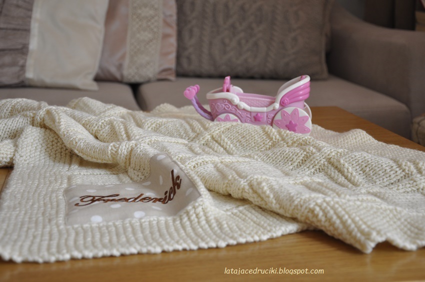 Kocyk dla maluszka popełniłam z podwójnej nitki Alize Baby Wool 01 drutami 6 mm. Wyszło 6 moteczków czyli jakieś 300 g. Niestety w pośpiechu nie zważyłam i zmierzyłam robótki. Wzór znalazłam w katalogu z lat 80 takie najprostsze kwadraty. Mały Frederick już pojawił się w rodzinie i spokojnie leży na kocyku, a za kilka chwil przybędzie nam kolejny członek rodziny to dziergam kolejne kocyki.