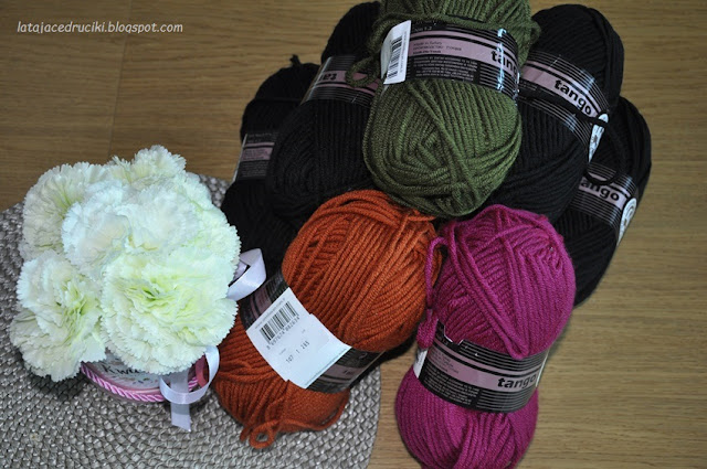 Hm....... nie wiem co czynić! Dostałam takie pięknie jesienne kolorowe motki. Wymyśliłam że zrobię sobie czarny pasiaczek . Takie szerokie kolorowe coś. Zaczęłam to cudo, macham sobie grubymi drutami i stanęłam rozczarowana. To cudo wcale cudem nie jest. Nie wiem czy lepiej zmienić czarny na jakiś jaśniejszy odcień, czy może połączyć wszystko jakąś kolorową cieniutką nitką. Stoję i pomysłów brak, a może wzór / z głowy/ nie taki? Niestety to co zrobione już sprute. Liczę na Was - Pomocy!!!!!!!! Ogarnęła mnie niemoc twórcza!