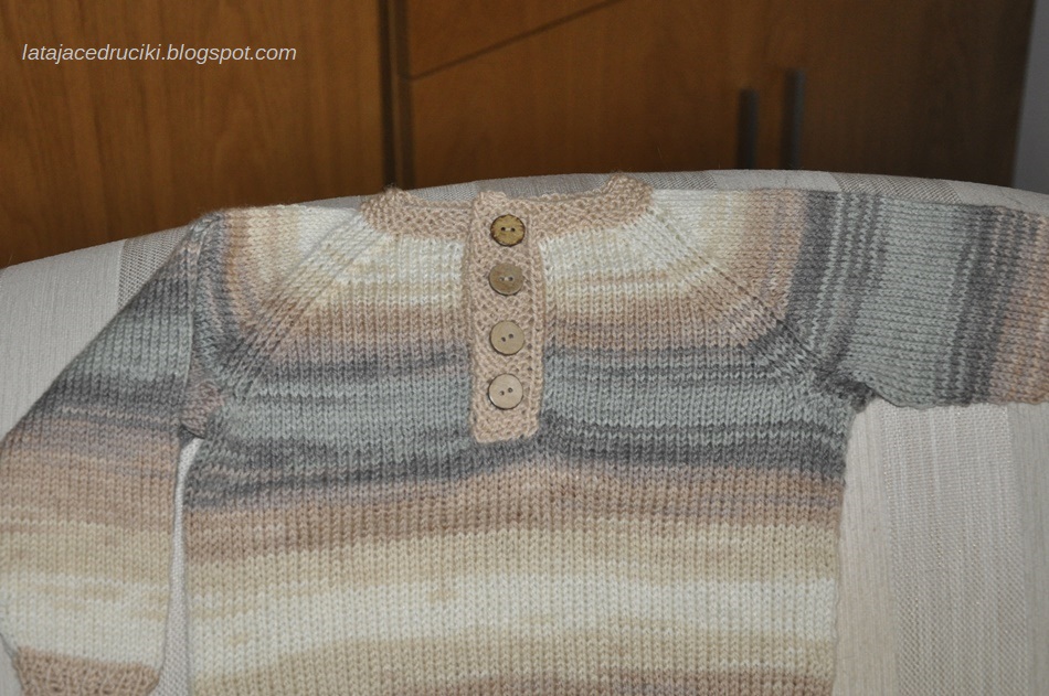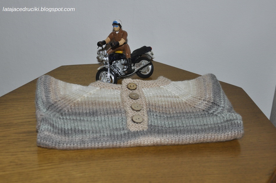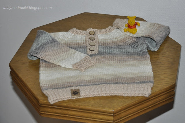 Ponieważ w mojej rodzinie pojawiło się kilku nowych obywateli. Każdy z maluszków musi dostać prezent od cioci. Żeby nie było niesnasek i zazdrości postanowiłam że sweterki muszą być bardzo podobne i mogą różnić się tylko kolorami. Dlatego też powstał kolejny pasiaczek. Włóczka to sprawdzona już Alize CottonBaby Soft. Podstawowy kolor nr 240. Druty 3,5 mm