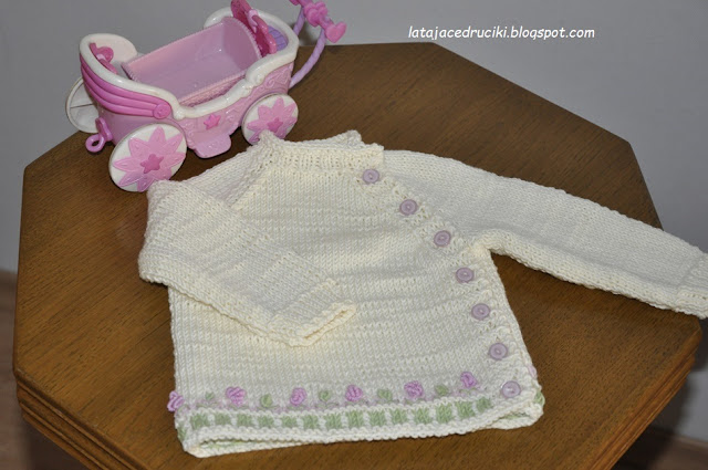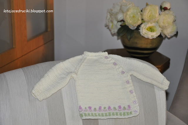 Hura, pojawiła się wśród nas maleńka, bardzo wyczekiwana istotka. Młoda dama musi mieć wypełnioną szafę, to zabrałam się do pracy. Teraz mogę pokazać co dla niej przygotowałam. Jako pierwszy powstał bawełniany, zapinany z boku sweterek w kolorze ecru. Z przodu dla ozdoby wyszyłam liliowe kwiatki, z tyłu natomiast jest tylko wrabiany wzór. Przecież Małą Księżniczkę nic nie może gnieść w plecy. Hura - już nie jestem tylko ciocią, ale dumną babcią!