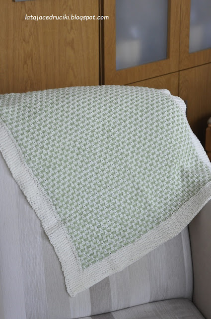Zaraz za sweterkiem pojawił się kocyk. Zrobiony z tej samej włóczki Alize Cotton Baby Soft, tworzy komplecik. Bawełniane okrycie jest idealne na letnie wieczorne spacery.
