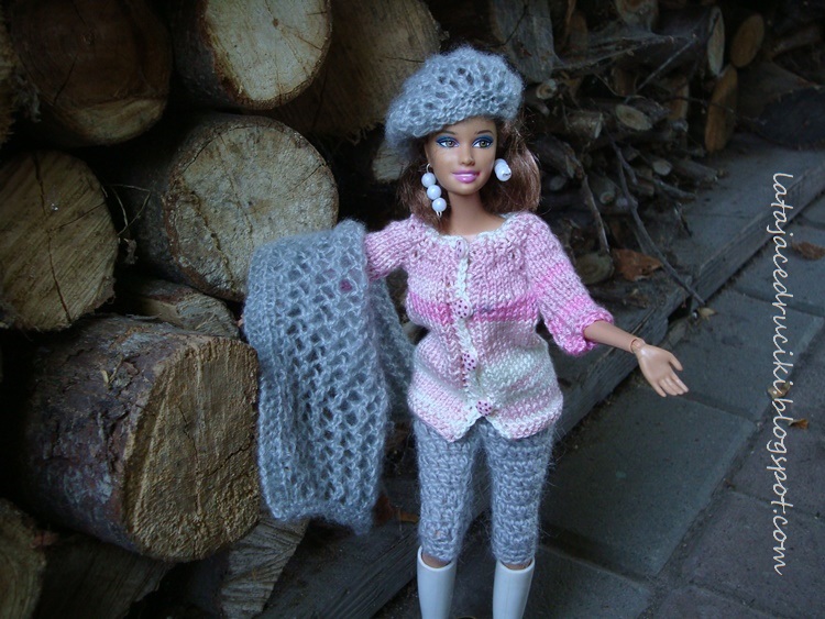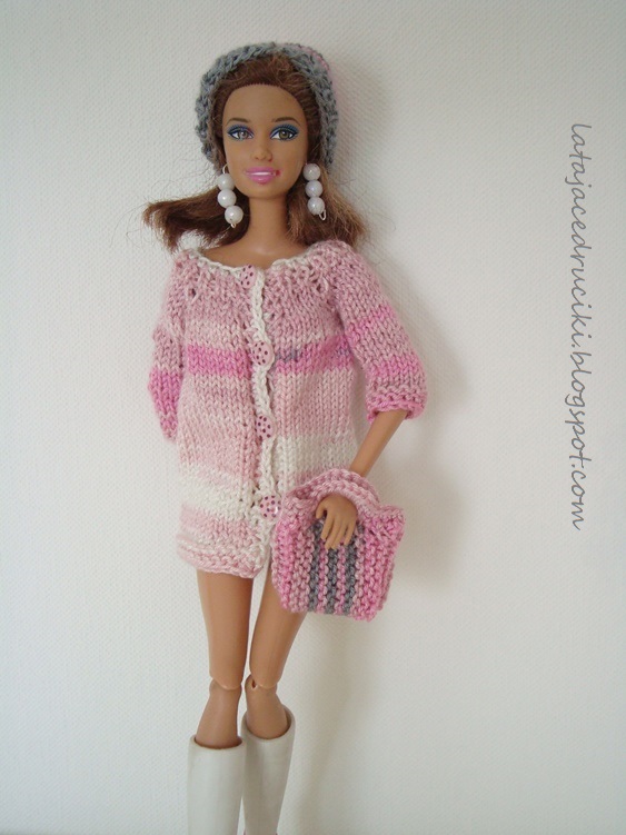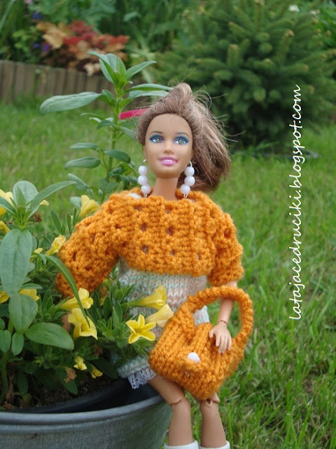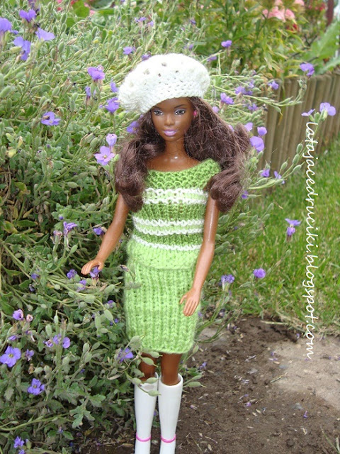 Pewna Młoda Dama zażyczyła sobie zieloną bluzeczkę dla lalki . Bluzeczka proszę bardzo zrobiona , ale hm sama bez niczego w żadnym razie . Tak też powstała pasująca do bluzeczki spódniczka, torebka oraz odpowiednie nakrycia głowy .